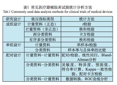 表1列舉了常見醫(yī)療器械臨床試驗統(tǒng)計分析方法,下面分別加以說明。